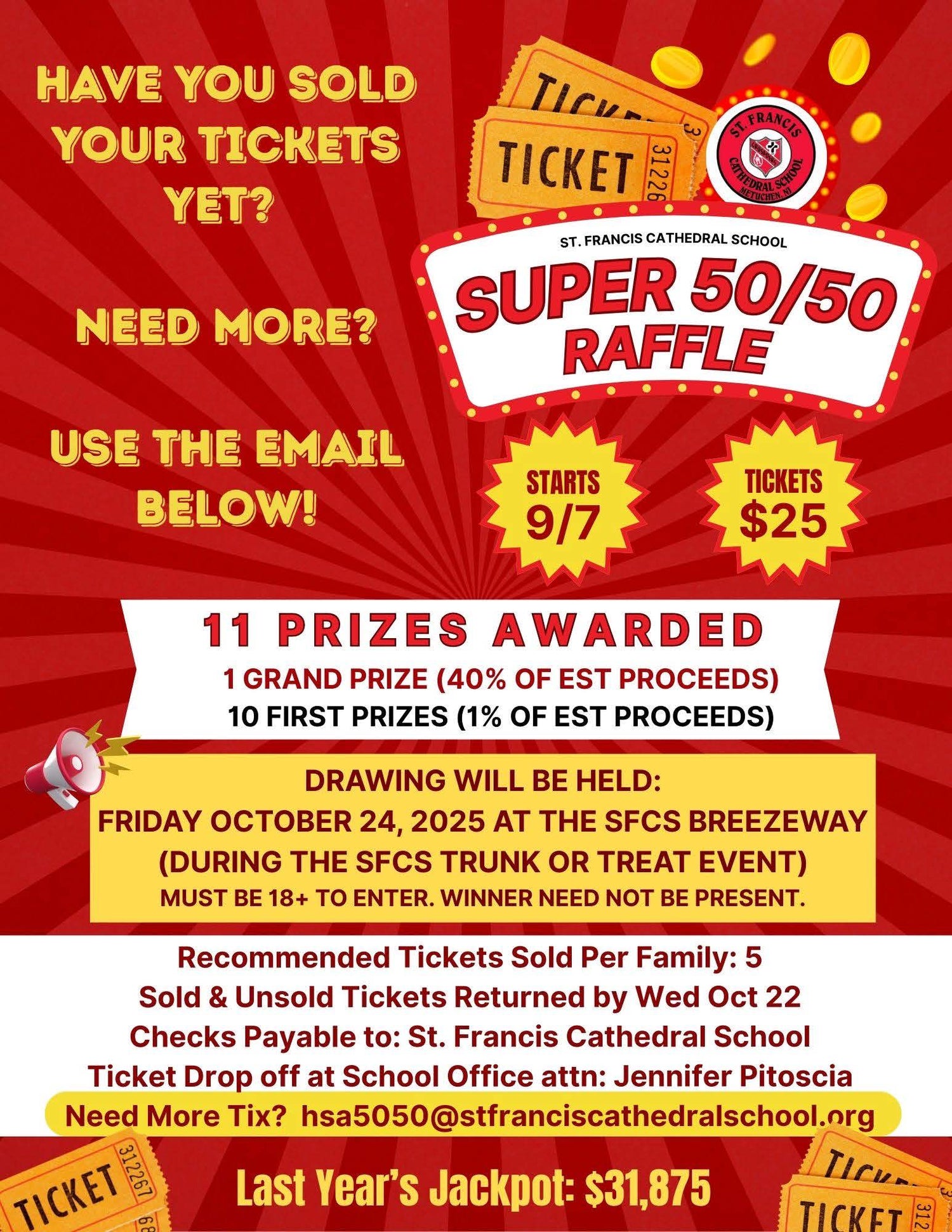 Be part of St. Francis Cathedral School’s annual Super 50/50 Raffle! Tickets are $25 each and every purchase directly supports our school community.